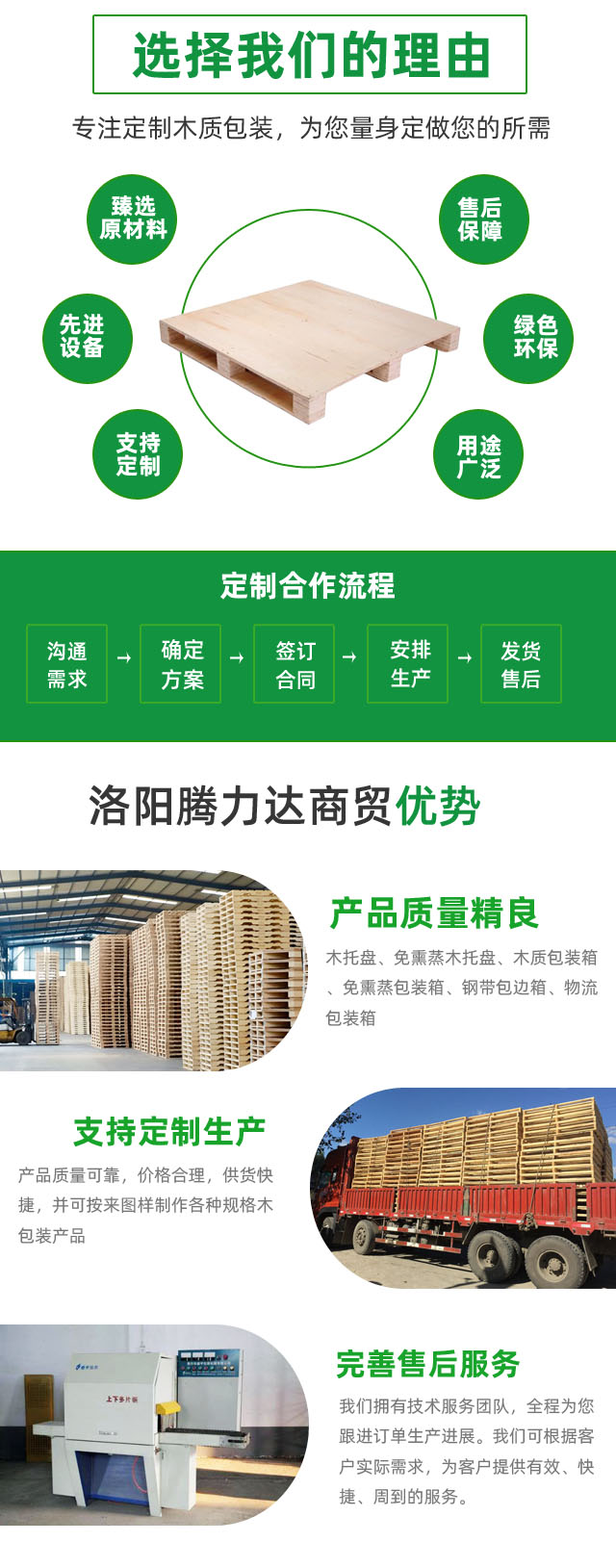 洛陽(yáng)騰力達(dá)商貿(mào)有限公司是以生產(chǎn)木質(zhì)托盤(pán)、膠合板托盤(pán)、普通木箱、木鏟板、墊包板、墊包板及各種機(jī)械設(shè)備木箱包裝。